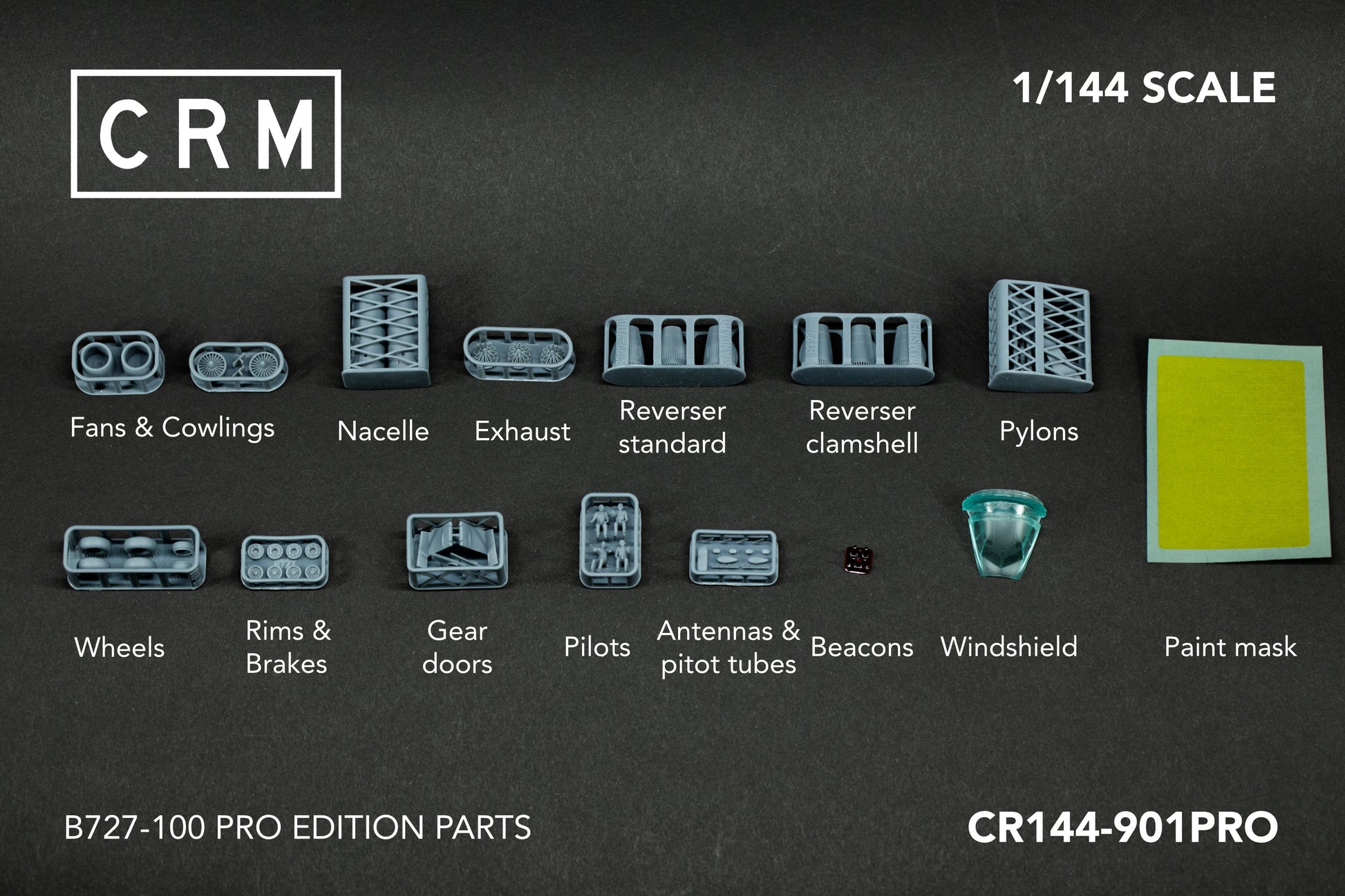 - All available resin accessories (engines, tyres, pilots, antennas, anti-collision lights, cockpit windshield)